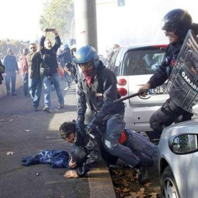 La carica di Ponte Sisto non è l’unica provocazione della giornata romana dello sciopero europeo del 14 novembre. Verso le dieci, cento neofascisti erano a piazza del Popolo a mimare, a uso e consumo della teoria degli opposti estremismi, un improbabile assalto alla Camera. La polizia li carica ma quasi con garbo e la questura rimedia qualche contuso da esibire come vittima del dovere e nessun fermo. Quattro ore dopo le botte e la caccia all’uomo e un grottesco, arrogante, comunicato del portavoce della comunità ebraica, Pacifici, che chiede di vietare le manifestazioni dopoe essere stato “offeso” da una bandiera della Palestina che è sfilata sotto la sinagoga romana, sul lungotevere. Mentre andiamo in rete un’assemblea a Lettere della Sapienza prova a fare il bilancio di feriti e arrestati. Il paradosso è che un presidio sotto Montecitorio s’è svolto davvero, l’hanno convocato i Cobas e l’hanno raggiunto anche un migliaio di lavoratori autoconvocati e docenti del coordinamento delle scuole in lotta che si sono staccati dal corteo della Cgil che ha volutamente girato al largo rispetto agli studenti. (da popoff)