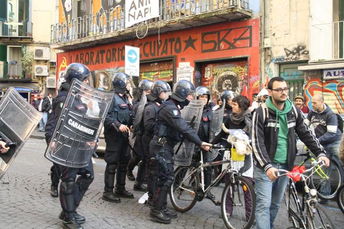 Quando gli studenti sono usciti tranquillamente dalla piazza i cordoni di polizia e carabinieri li hanno seguiti, trovando su Calata Trinità Maggiore un gruppo di ciclisti della critical Mass che si apprestavano a partire per un giro in bicicletta nel centro storico di Napoli, per mettere in scena il “presepe morente”. Alcuni dei ciclisti infatti erano in maschera per mostrare il declino della città.