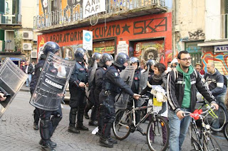 Stamane mentre le facoltà occupate svolgevano ciascuna le proprie attività, a palazzo Giusso gli studenti discutevano di futuro, precarietà, università e ricerca, il centro storico di Napoli è stato blindato per la manifestazione annuale in onore della Madonna Immacolata (foto). Nei pressi della centralissima Piazza del Gesù, la polizia in assetto celere ha caricato degli attivisti della Critical Mass, radunati pacificamente per rivendicare come loro solito piste ciclabili e trasposto sostenibile, l’unica colpa dei manifestanti in bicicletta è stata la coincidenza della loro protesta con il luogo e il momento della celebrazione religiosa ed istituzionale. Due manifestanti, un ragazzo e una ragazza, dopo esser stati pestati sono stati fermati e arrestati (video).