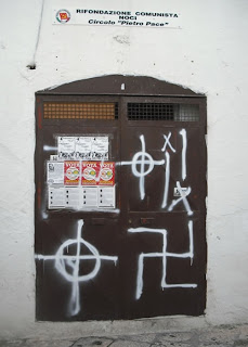 Sembra avere ripercussioni serie l’atto vandalico effettuato contro la sede locale del partito di Rifondazione Comunista. I graffiti colorati a spray sulla porta d’ingresso del partito raffigurano svastiche e croci celtiche simbolo di una cultura che ormai non c’è più e che ci si augura che non ritornasse.